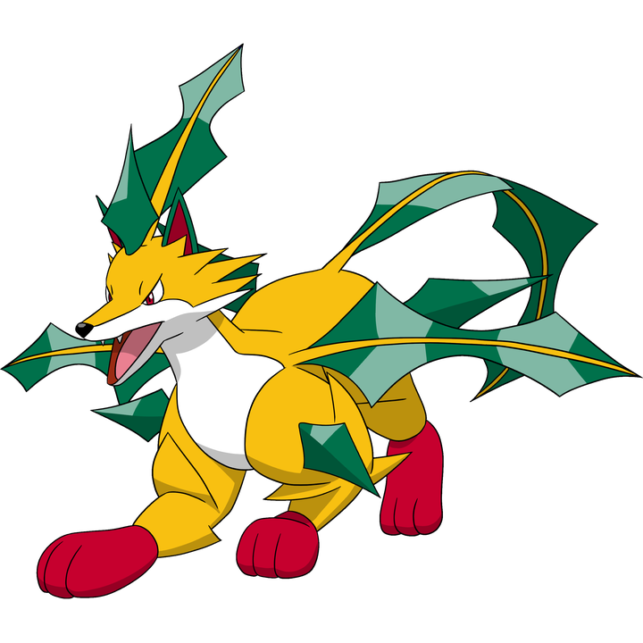 たくさんの大きな葉っぱで光を浴び、体内で電気に変換するぞ。大量のエネルギーで、素早い行動ができる。爪からの電気攻撃はとても強力だ。